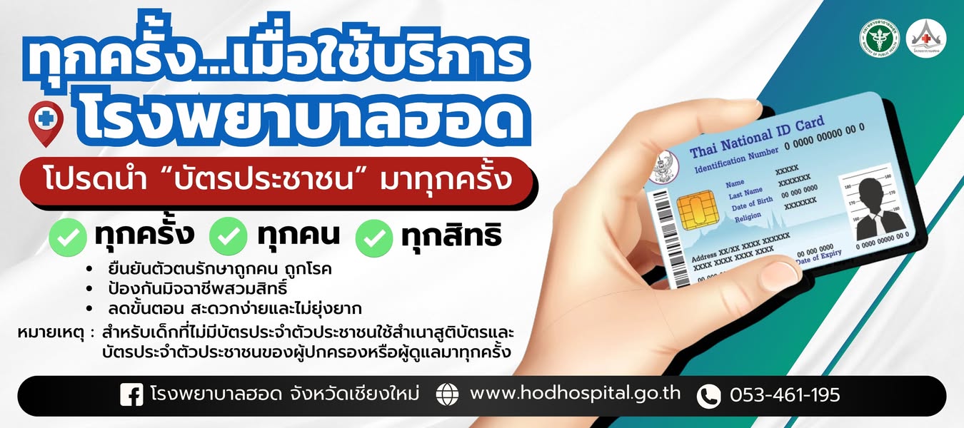 ประชาสัมพันธ์ผู้ใช้บริการทุกท่าน ทุกครั้ง เมื่อมาใช้บริการโรงพยาบาลฮอด ให้นำบัตรประจำตัวประชาชนมาทุกครั้ง