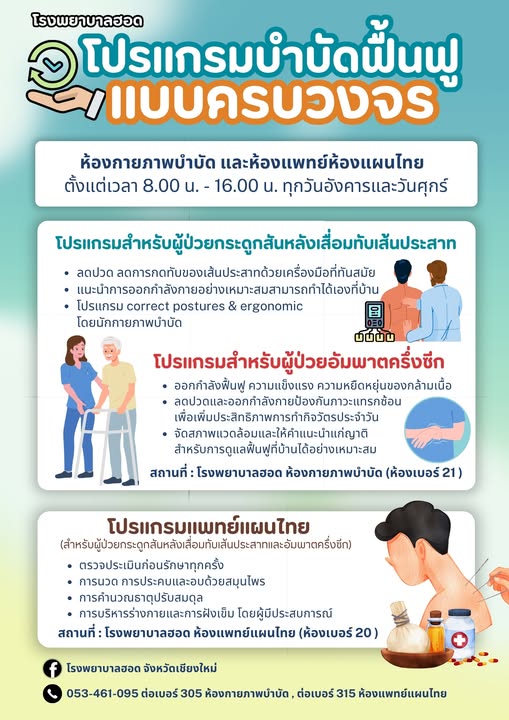 Posted inกิจกรรม ประชาสัมพันธ์ โปรแกรมการดูแลรักษารูปแบบใหม่ พร้อมให้บริการแล้ว โปรแกรมการดูแลรักษารูปแบบใหม่ พร้อมให้บริการแล้ว ณ โรงพยาบาลฮอด ห้องกายภาพบำบัด ( ห้องเบอร์ 21 ) และห้องแพทย์ห้องแผนไทย ( ห้องเบอร์ 20 ) ตั้งแต่เวลา 8.00 น . ถึง 16.00 น. ในทุกวันอังคารและวันศุกร์ ติดต่อสอบถามเพิ่มเติม ห้องกายภาพบำบัด ( ห้องเบอร์ 21 ) และห้องแพทย์ห้องแผนไทย ( ห้องเบอร์ 20 ) ณ โรงพยาบาลฮอด โทร 053-461095 ต่อ 305 ห้องกายภาพบำบัด , ต่อเบอร์ 315 ห้องแพทย์แผนไทย